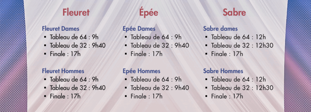 Au programme : épée, sabre, fleuret, chez les hommes et les dames en individuel.Les meilleurs tireuses et tireurs du pays s’affronteront pour décrocher le titre tant convoité de Champion(ne) de France Élite !