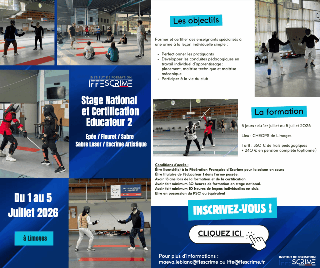 Destiné aux : Éducateurs 1 certifiés (Épée, Fleuret, Sabre, Sabre laser, Escrime Artistique)