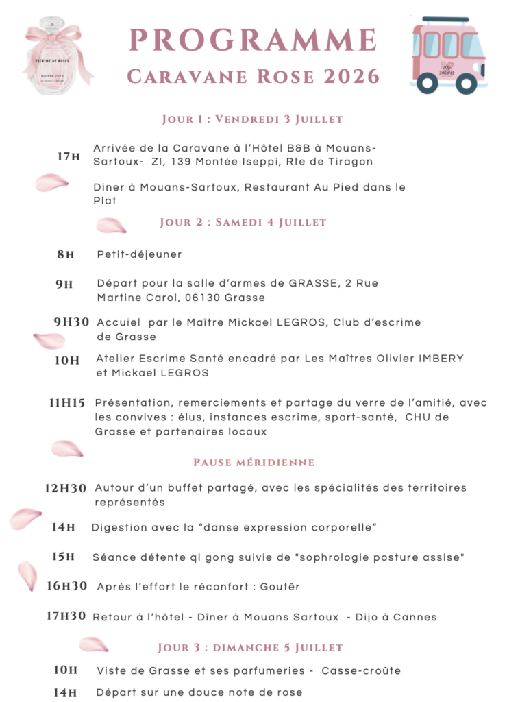 Portée par l’énergie de l’équipage Rose des Sabres, la Caravane Rose poursuit son engagement en faveur de l’escrime santé. En 2026, cet événement emblématique fête ses 10 ans dans un cadre exceptionnel : la ville de Grasse, capitale du parfum.